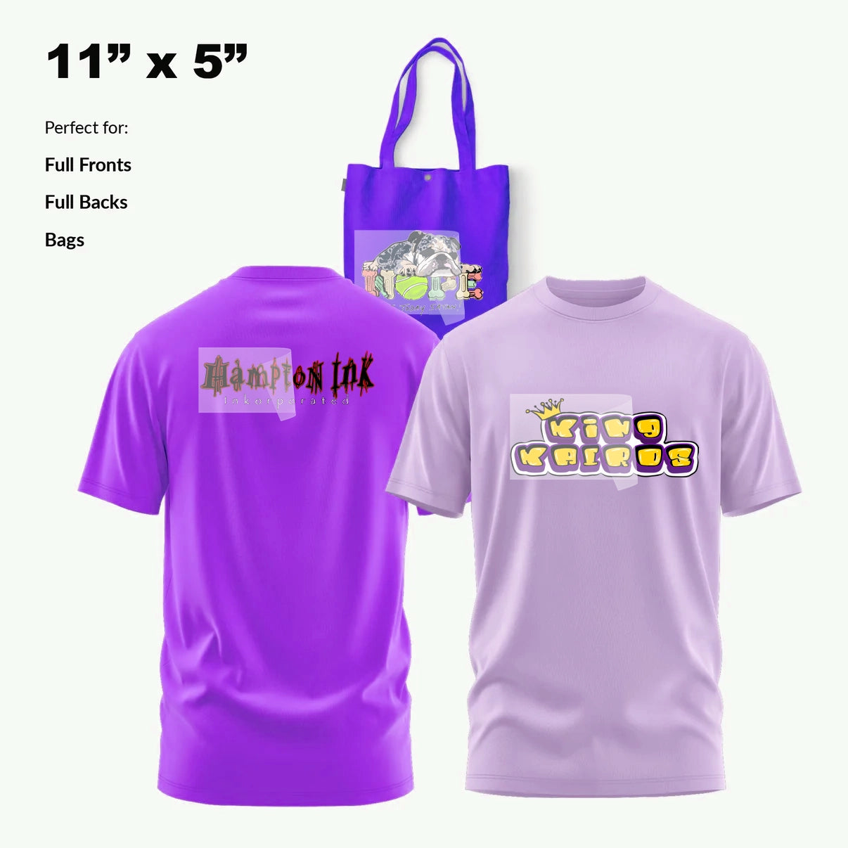 Create stunning and durable designs with our Custom DTF Transfers, available in a variety of sizes to fit all your printing needs. Perfect for hobbyists, at-home print shops, and professional printers, our custom DTF transfers ensure vibrant colors and precise details for all your projects.